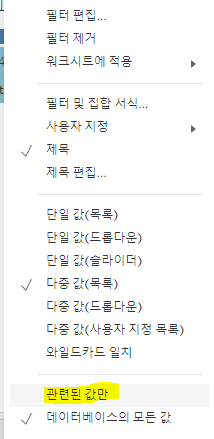 5. 시도와 시군구 필터는 표시해주고 각각 단일 값(목록)과 단일 값(드롭다운)을 선택해준다. 이때 관련된 값만을 체크하여 서울시를 눌렀다면 서울시의 시군구만 나올 수 있게 조정해준다.