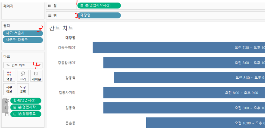 매장 별 오픈시간과 마감시간, 영업시간을 시각화 할 경우