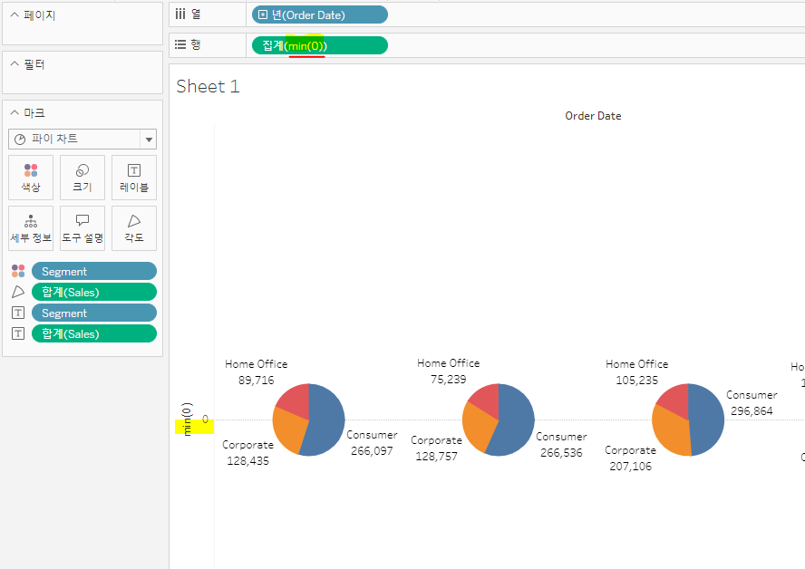 행 선반을 더블클릭해 min(0)을 입력해 공통의 축을 하나 만들어준다.