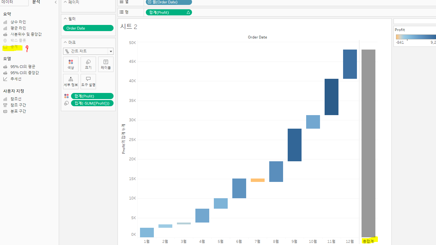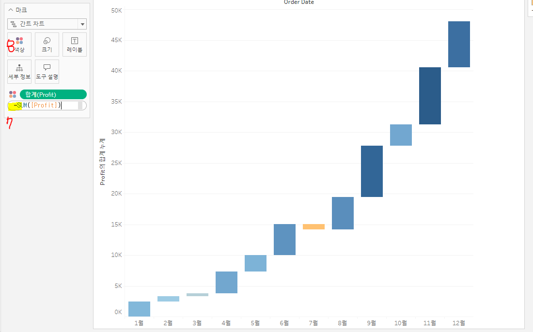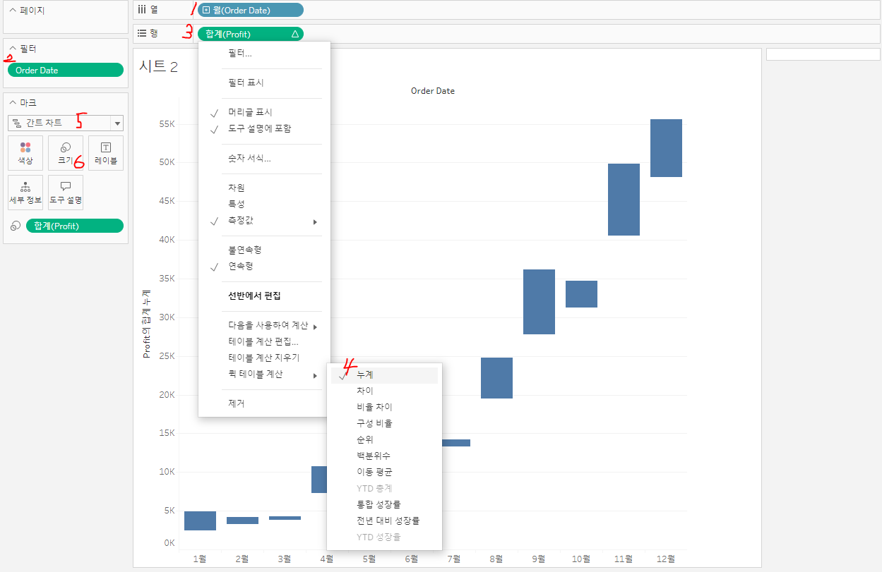 3. 수익을 행 선반에 4. 워터폴 차트는 기본적으로 누적된 겂을 그려야 하기 때문에 테이블계산의 누계로