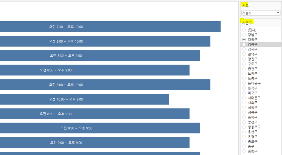 5. 시도와 시군구 필터는 표시해주고 각각 단일 값(목록)과 단일 값(드롭다운)을 선택해준다. 이때 관련된 값만을 체크하여 서울시를 눌렀다면 서울시의 시군구만 나올 수 있게 조정해준다.