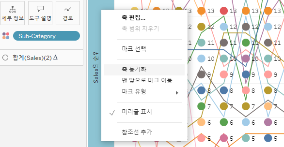 4. 행 선반에 있는 매출을 테이블 계산을 이용해 순위로