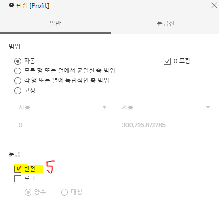 5. 복사된 측정값의 축을 더블클릭하여 눈금 > 반전을 체크해 준다.