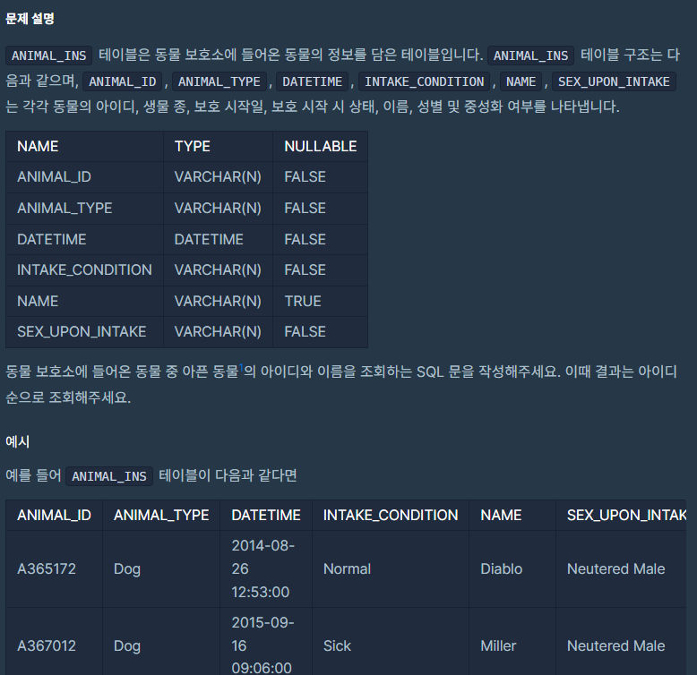 프로그래머스 - 아픈 동물 찾기, 어린 동물 찾기 (!=) 본문