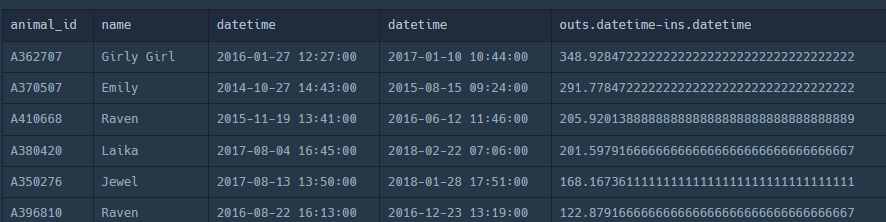 SELECT INS.ANIMAL_ID, INS.NAME, INS.DATETIME, OUTS.DATETIME, OUTS.DATETIME - INS.DATETIME