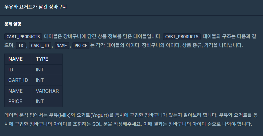 1번째 줄 DISTINCT를 이용해 중복제거해서 cart_id를 표현했다.