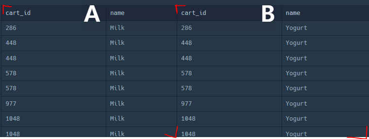 3~10번쨰 줄 인라인뷰 안쪽은 Milk를 구입한 고객ID만 뽑아 A테이블을 Yogurt만 구입한 고객ID만 뽑아 B테이블을 만들었다. 그 후 JOIN을 통해 공통으로 포함된 cart_id를 추출했다.
