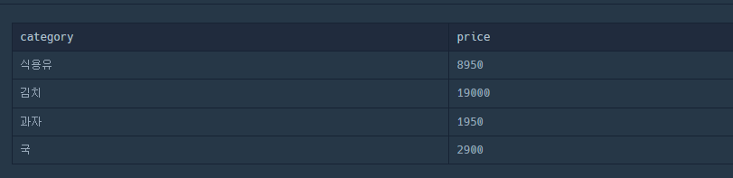 다음과 같이 카테고리 별 최대 PRICE를 구해준다.