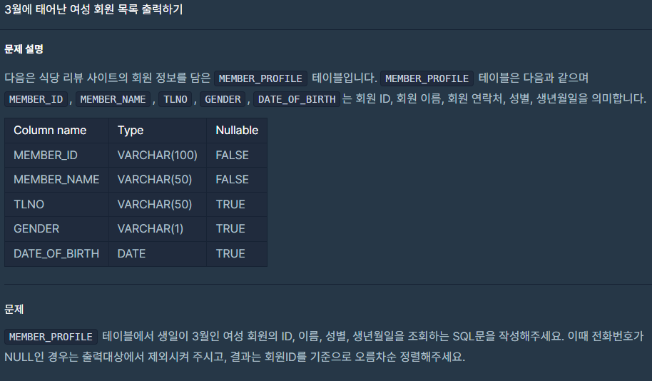 프로그래머스 - 3월에 태어난 여성 회원 목록 출력하기 (TO_CHAR) 본문