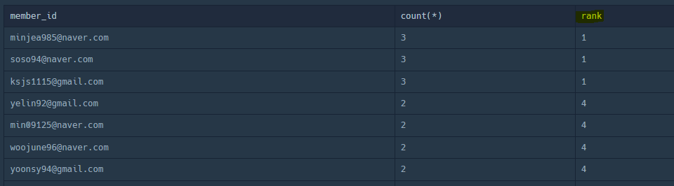 SELECT MEMBER_ID, COUNT(*), RANK() OVER(ORDER BY COUNT(*) DESC) AS RANK