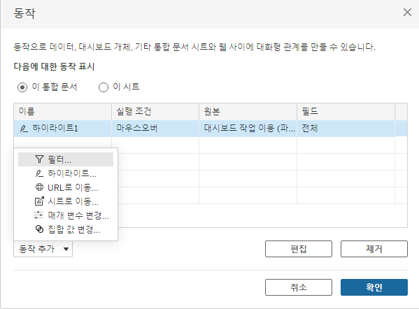 동작은 필터, 하이라이트, URL로 이동, 시트로 이동, 매개변수 변경, 집합 값 변경을 설정 가능하다.