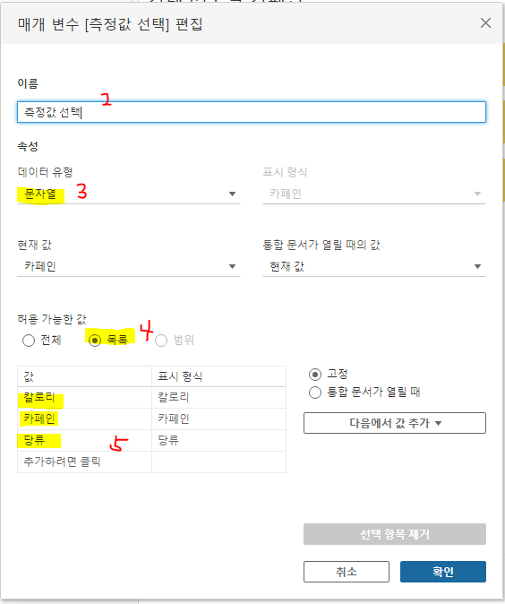여러 개의 측정값(칼로리, 카페인, 당류)를 선택할 수 있는 매개 변수를 만든다!