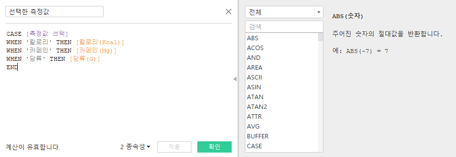 매개 변수( [측정값 선택])에서 값("칼로리")를 선택하면 측정값([칼로리])을 가져오도록 작성한다.