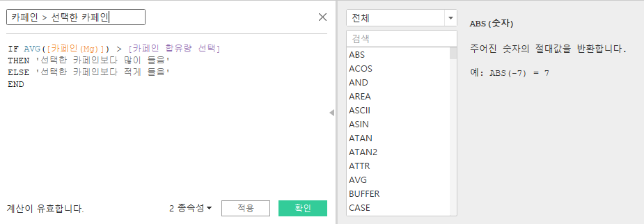 "평균 카페인"이 [카페인 함유량 선택] 보다 크면 '선택한 카페인보다 많이 들음' 작으면 ' 선택한 카페인보다 적게 들음' 으로 나오게 작성한다.