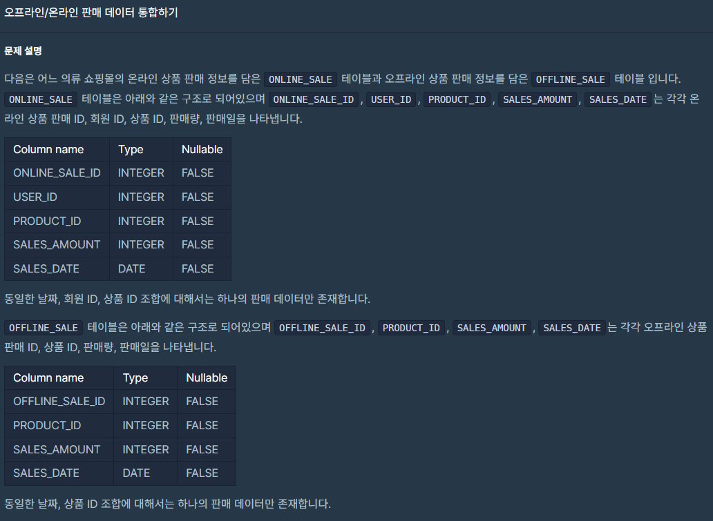 ONLINE_SALE테이블과 OFFLINE_SALE테이블의 모든 값을 가져오기 위해 UNION ALL을 활용했다.