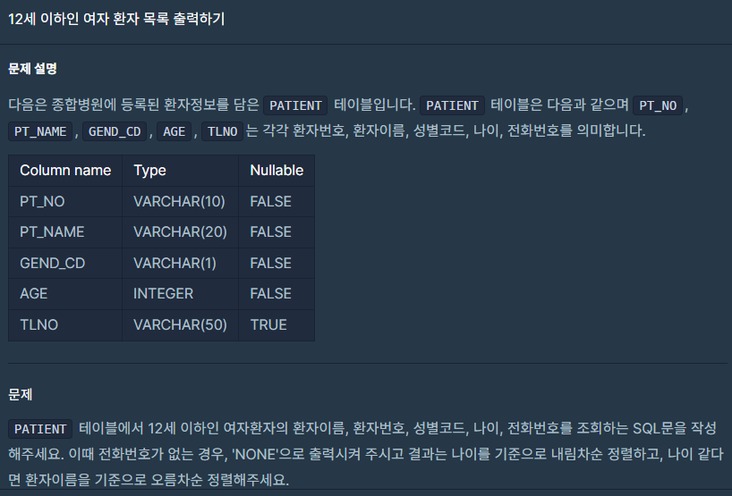 프로그래머스 - 12세 이하인 여자 환자 목록 출력하기 (NVL) 본문