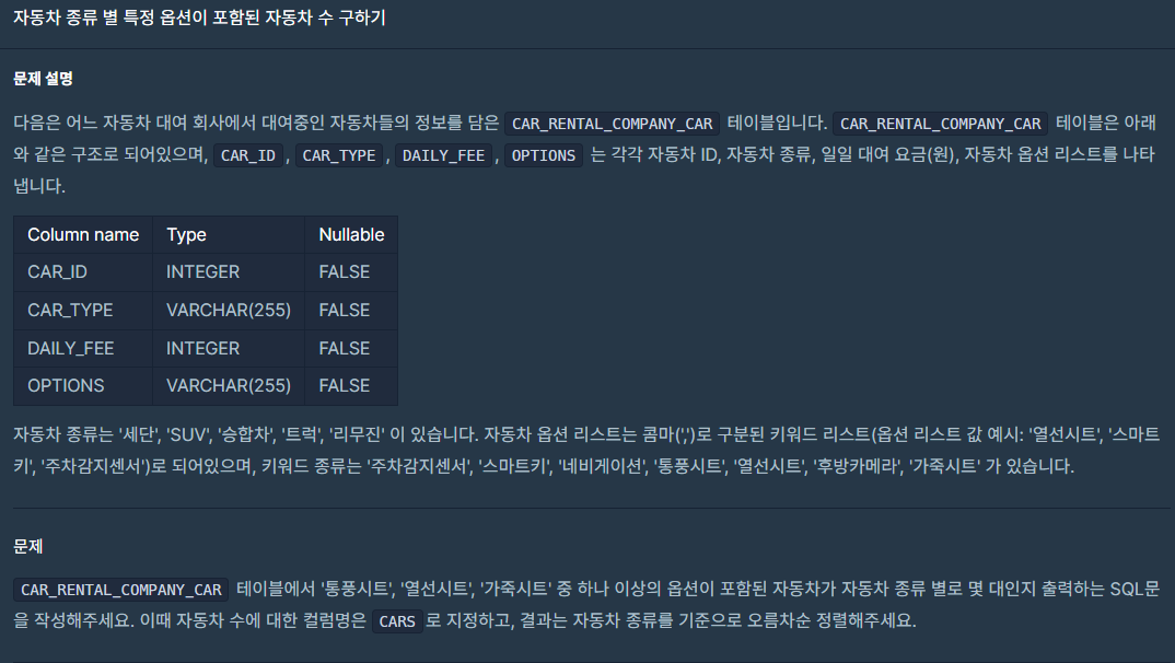프로그래머스 - 자동차 종류 별 특정 옵션이 포함된 자동차 수 구하기 (LIKE) 본문