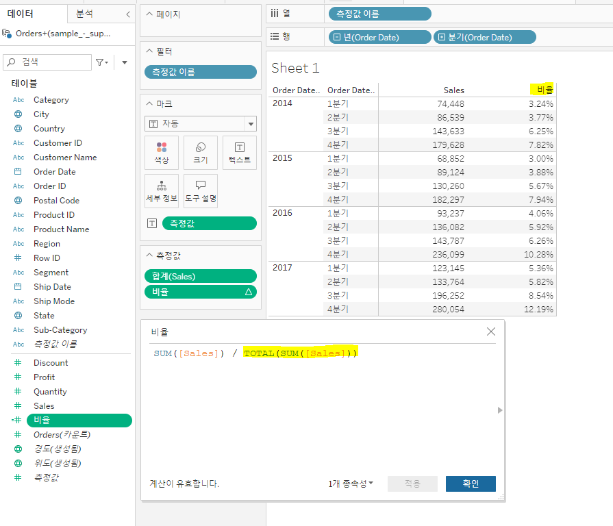테이블 계산에서 차이를 선택하면 다음과 같은 계산된 필드가 생성된다.