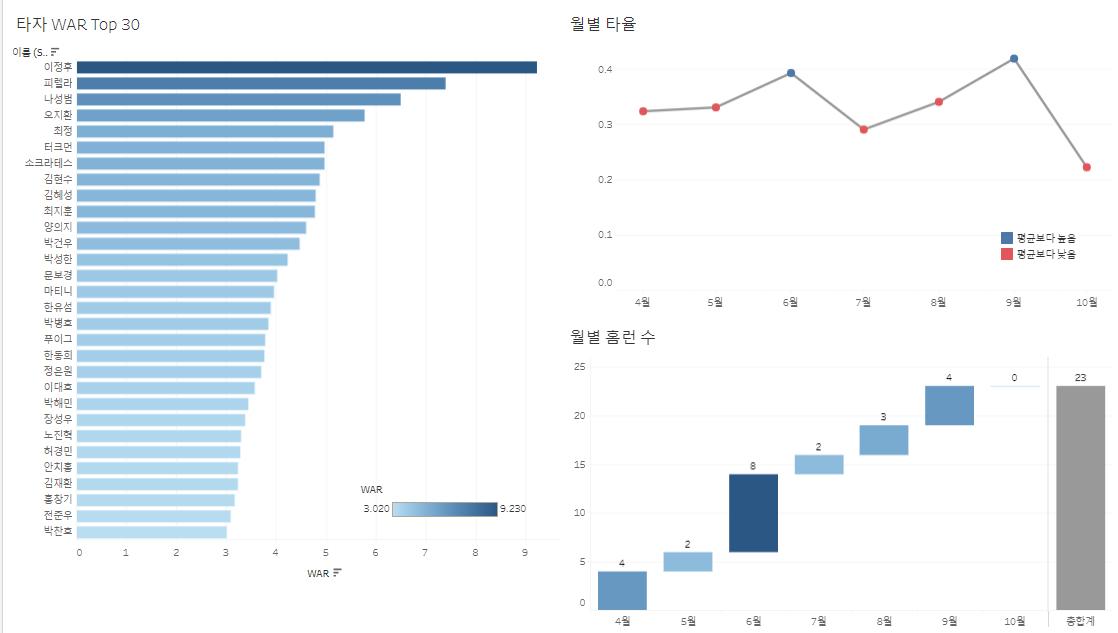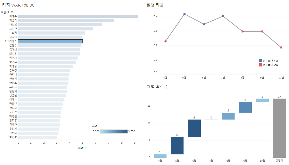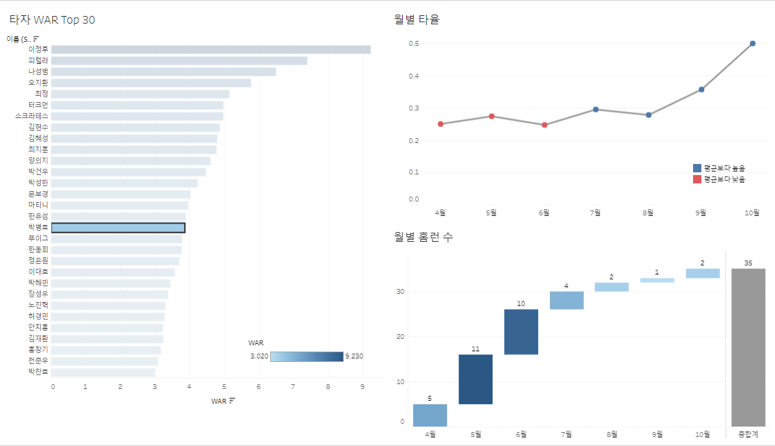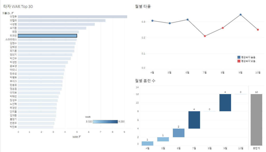 2. 타자 WAR을 클릭하면 월별 타율과 월별 홈런 수가 필터링되어 클릭한 타자의 데이터가 나와야한다.