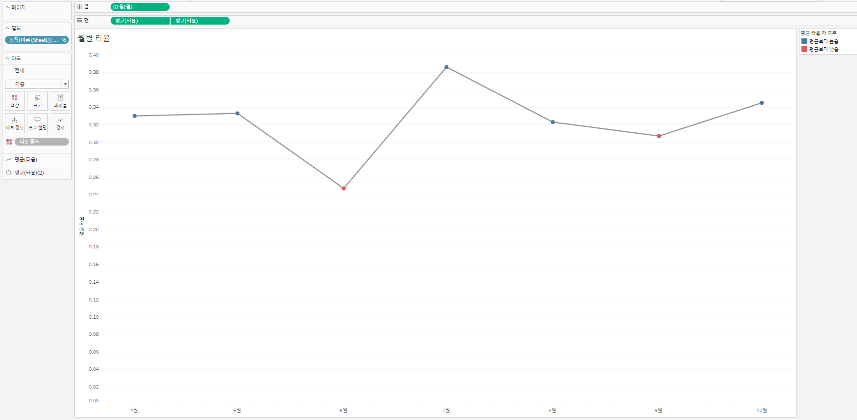 1. 행 선반에 '타율'의 평균을 열 선반에 '월' 데이터를 둔다. 이때 월 데이터는 연속형 월로 나타나게 설정