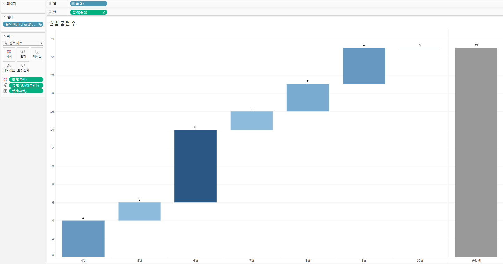 월별 홈런 수 그래프를 워터폴 차트형태로 나타냈다.