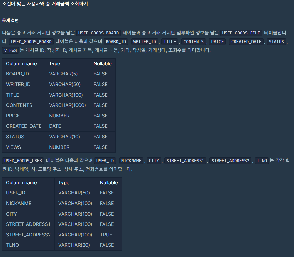 - 프로그래머스 조건에 맞는 사용자와 총 거래금액 조회하기