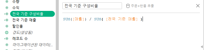 3. 세부수준 계산식(LOD) : 전국 기준 매출 구성비율 구하기